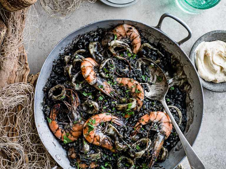 Roger Riera over Arroz Negro: "Het is een zeevruchten Paella met inktvis en gamba's, wat het speciaal maakt is de inktvis die de rijst zwart doet kleuren"