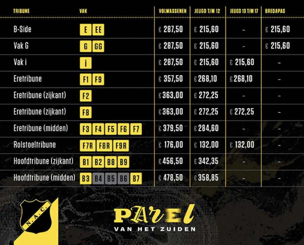 NAC heeft vandaag de nieuwe prijzen voor de seizoenkaarten gedeeld. De prijzen stijgen gemiddeld met 10 tot 15 procent, variërend van op welk vak je plaatsneemt. Daarnaast maakt de club bekend dat er 3000 mensen hebben aangegeven lid te willen worden van de Club van 1912.